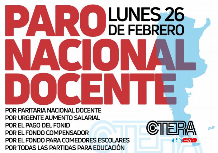El lunes 26 de febrero las clases empezarán con un paro docente de 24 horas en todo el paÃs, según lo definió la Confederación de Trabajadores de la Educación de la República Argentina (CTERA) en un congreso extraordinario.