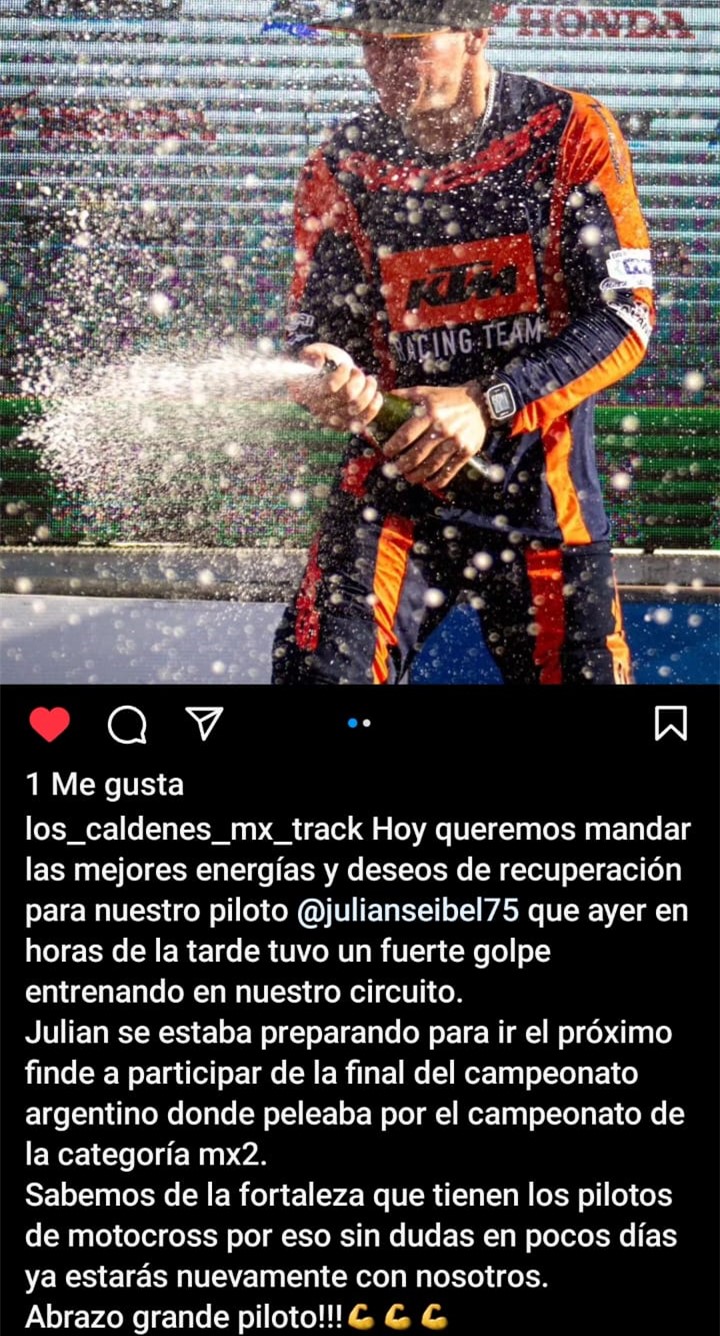 Los Caldenes Mx track enviaron un mensaje al piloto por medio de las redes sociales "Hoy queremos mandar lasmejores energias y deseos de recuperacion para nuestro piloto Julian Seibel que ayer en horas de la tarde tuvo un fuerte golpe entrenando en nuestro circuito. Julian se estaba preparando para ir el proximo fin de semana a participar de la ultima fecha del campeonato Argentino nacional donde peleaba por el campeonato en MX 2. Sabemos de la fortaleza que tienen los pilotos de motocross por eso sin dudas en pocos dias ya estaras nuevamente con nosotros. Abrazo grande piloto"