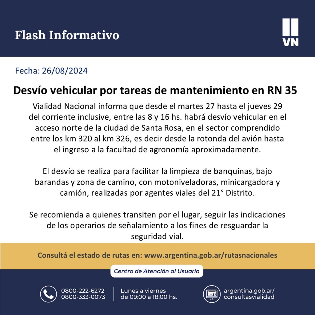 Desde el martes 27 al jueves 29 inclusive Vialidad Nacional estará llevando tareas en el ingreso a Santa Rosa. El comunicado enviado a este medio :