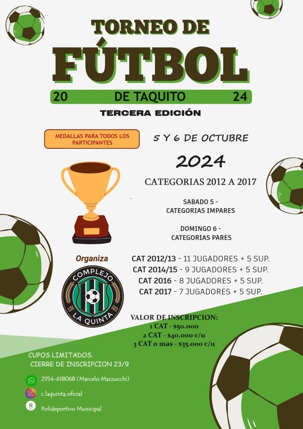 El próximo 5 y 6 de octubre las categorías 2012,2013,2014,2015,2016 y 2017 de futbol infantil disputaran una nueva edición del torneo infantil DE TAQUITO. Este evento es organizado por el complejo deportivo la Quinta y están confirmados los mejores equipos del centro del país.